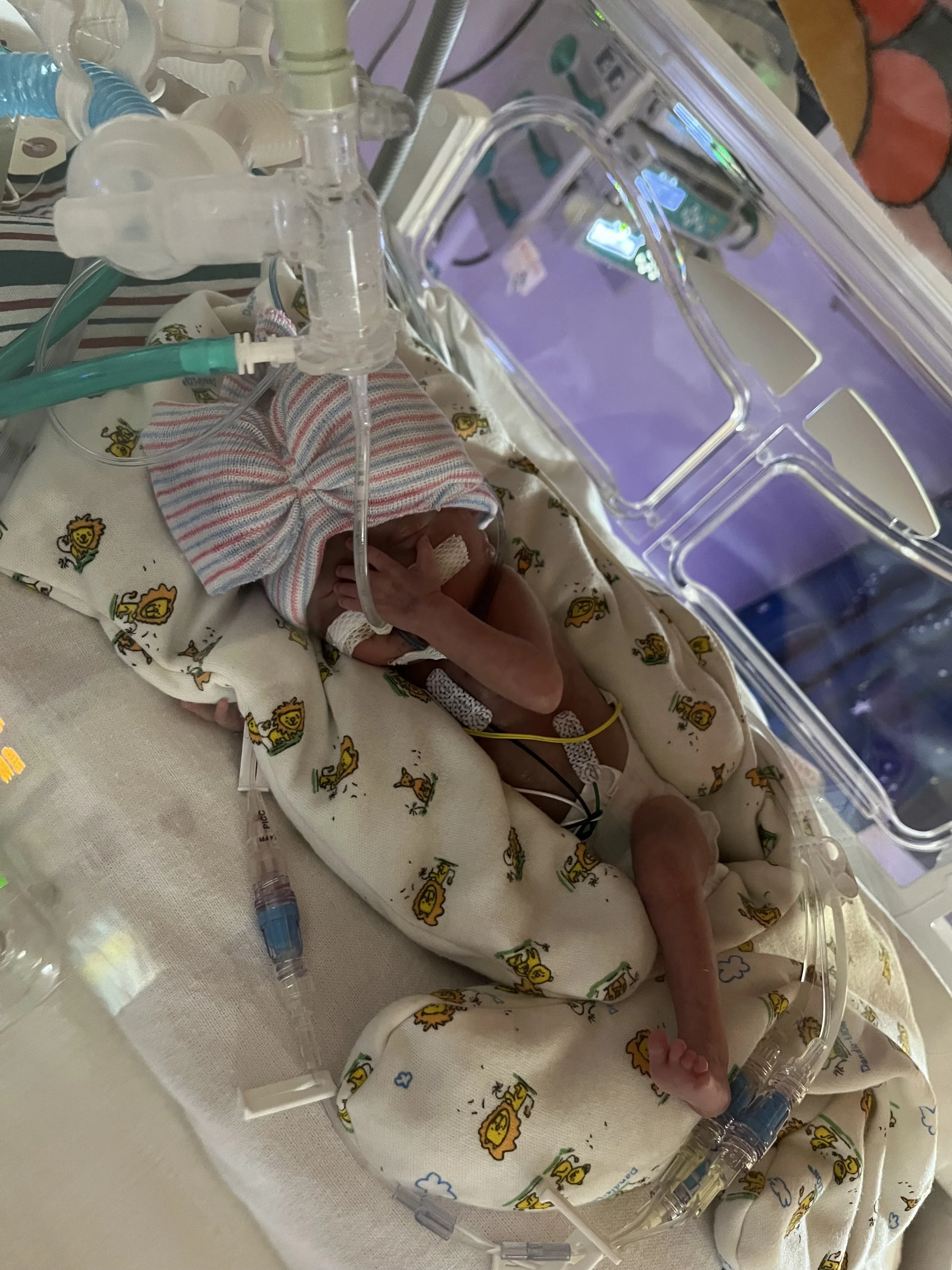 Now that she has crossed the 800 gram threshold (almost double her birthweight), we are starting to think about what it’s going to take to close her heart valve from a surgical perspective. For now our game plan is to transfer her via fixed wing medevac to Houston (or possibly Dallas) where they can do heart surgery on little tinies. It’s relatively non invasive—basically inserting a plug in a heart valve via a catheter that goes up her elbow—but the traveling will be equally difficult. They did a test on her today with a normal non-pulsing ventilator, one that will be needed for aircraft travel and surgery. She didn’t appreciate it, so for now we’re waiting and letting her grow.